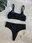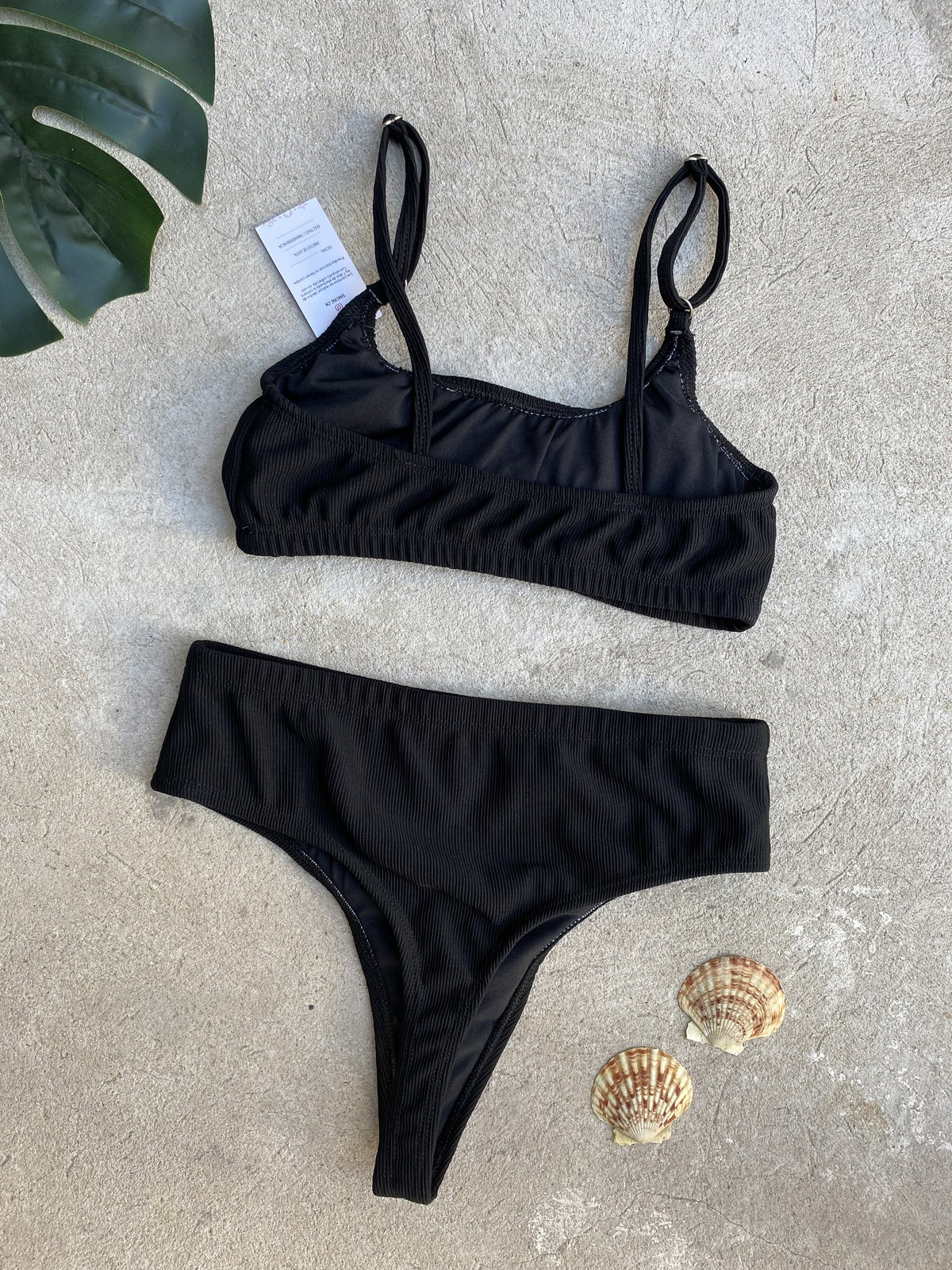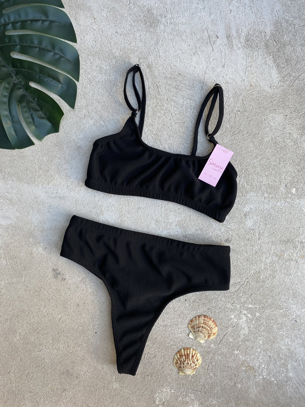 Corpiño estilo top con breteles regulables (forrada, no tiene aberturas para tazas). Bombacha colaless tiro alto de cintura ancha
