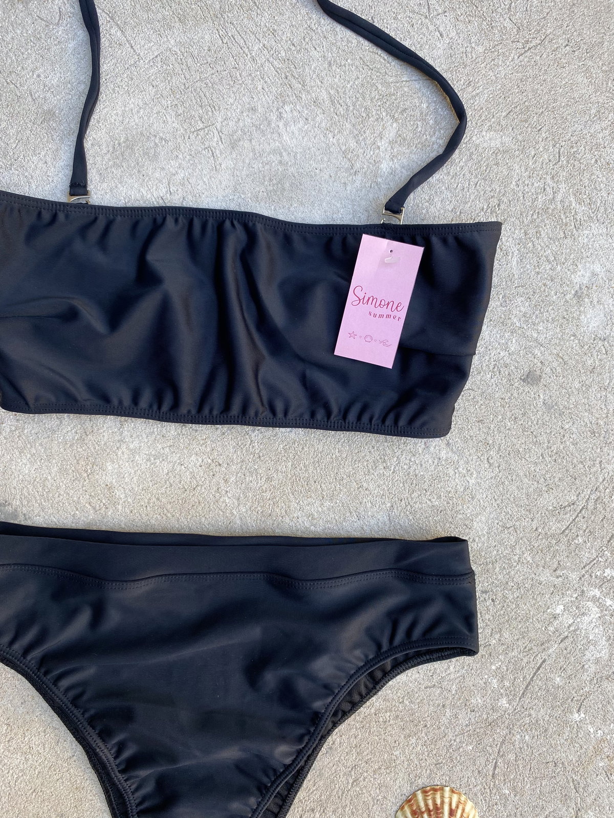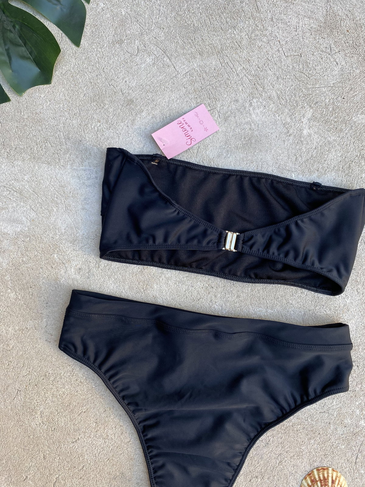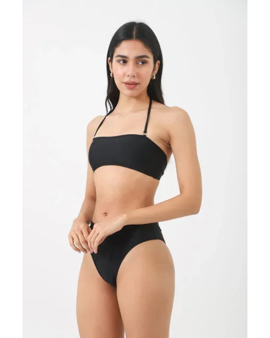 El corpiño tipo bandeau se convierte en strapless en segundos y se ajusta con un prĂĄctico broche en la espalda. La bombacha de corte clĂĄsico, vedetina y tiro alto, asegura una silueta favorecedora y cĂłmoda. Perfecta para tus dĂas de playa o pileta.