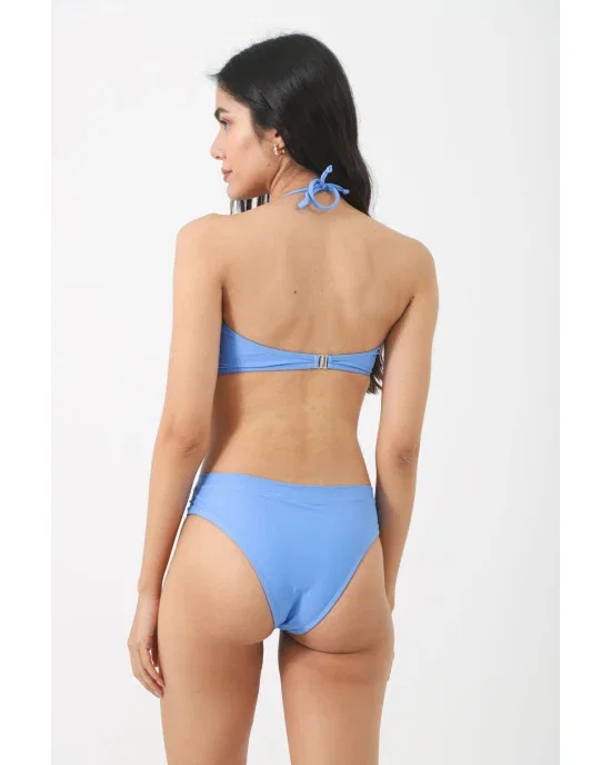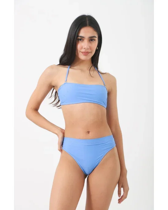 El corpiño tipo bandeau se convierte en strapless en segundos y se ajusta con un pråctico broche en la espalda. La bombacha de corte clåsico, vedetina y tiro alto, asegura una silueta favorecedora y cómoda. Perfecta para tus días de playa o pileta.