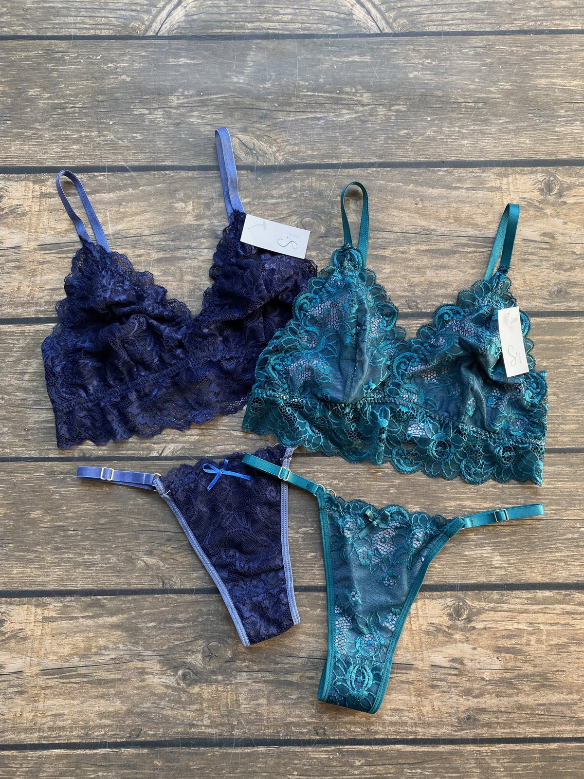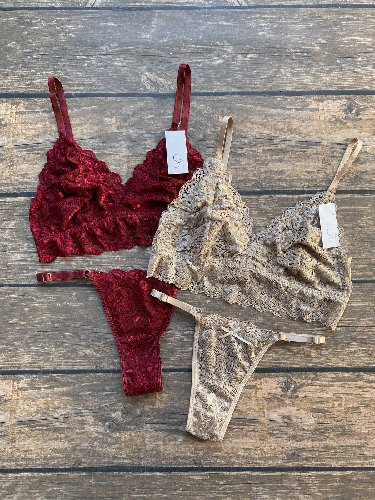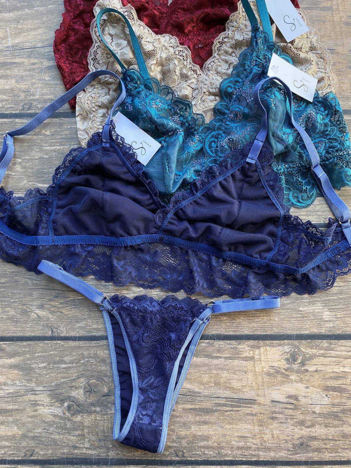 TODO EL CONJUNTO TIENE ELASTICOS DE RETENCION, muy importante para un buen agarre y para la durabilidad del conjunto, ya que evita que la puntilla se estire y deforme.