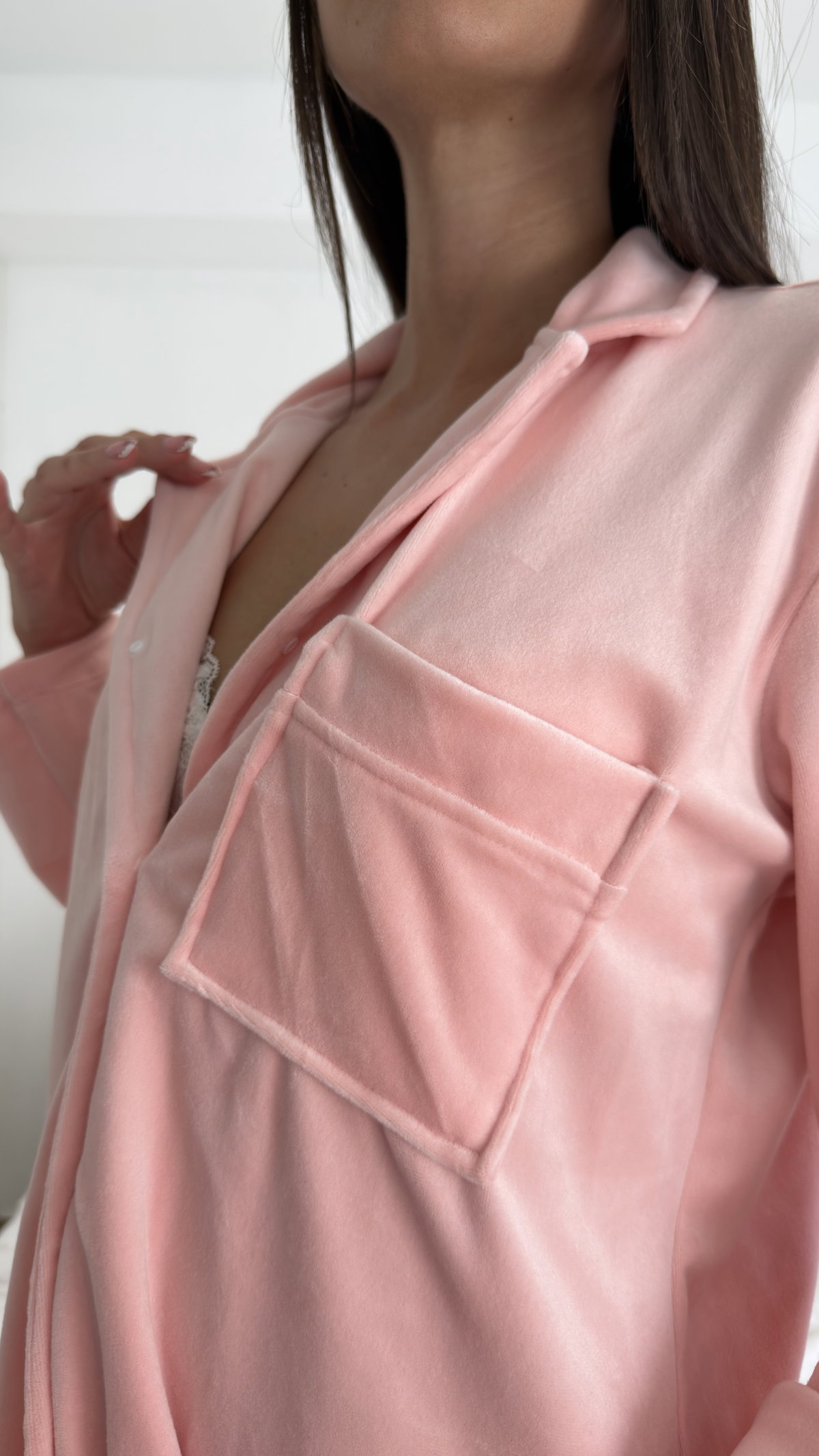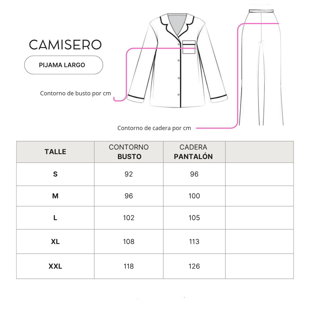 La camisa es mangas largas con bolsillo y broches a presión. El pantalón es con elástico en la cintura y sin bolsillos