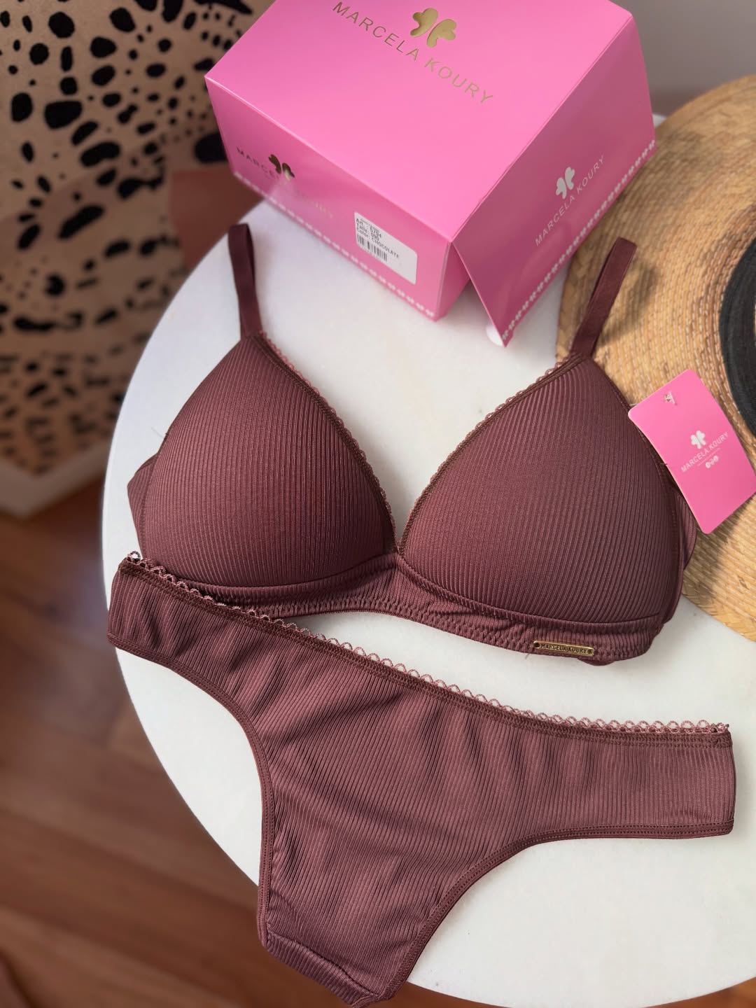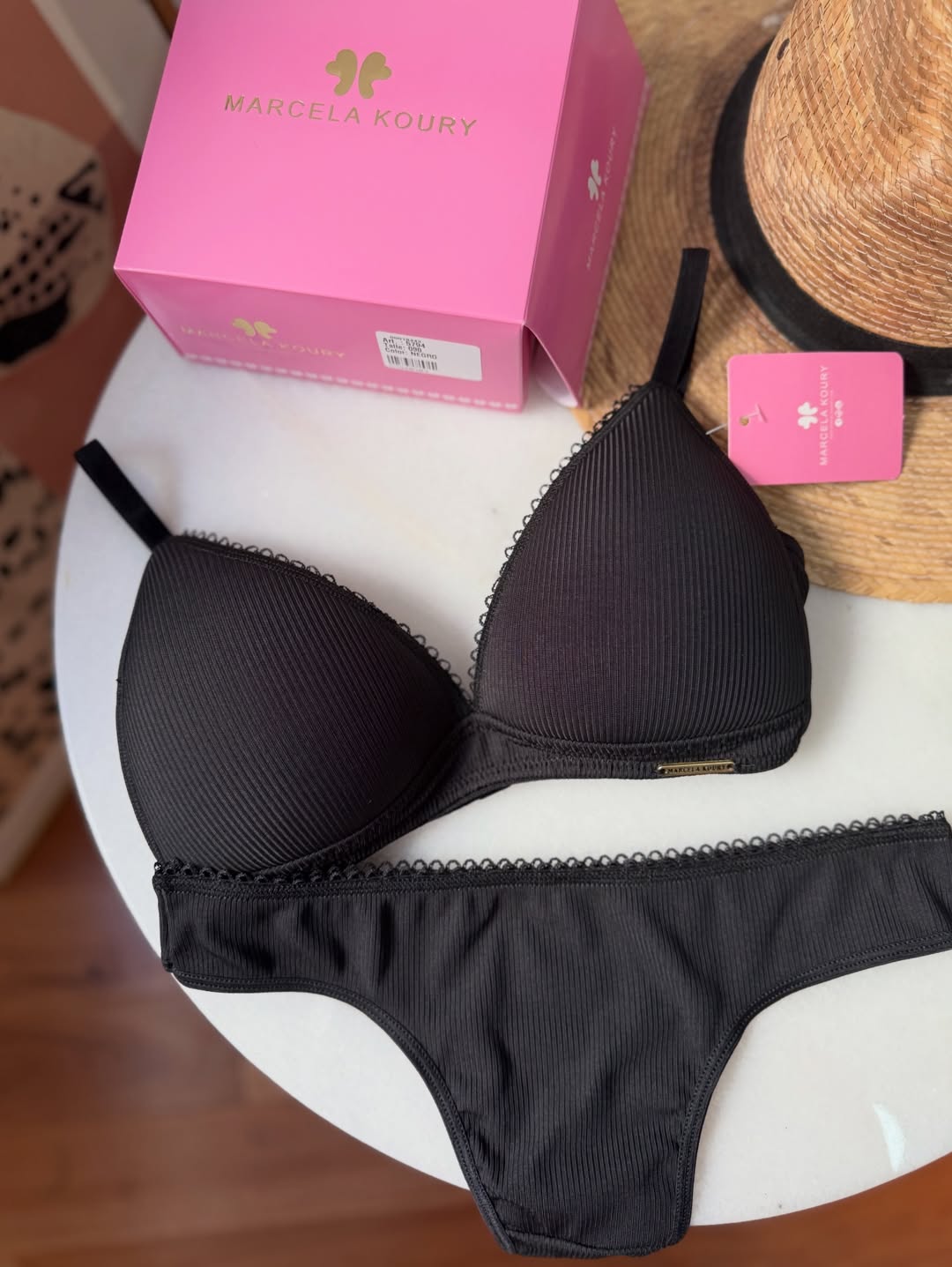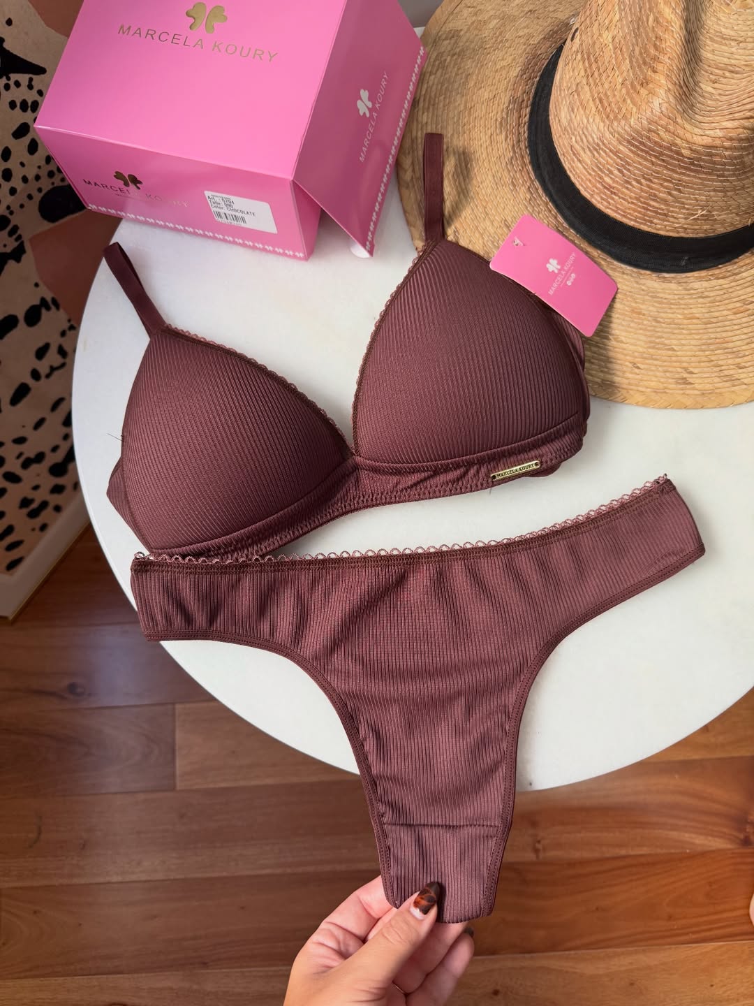 Corpiño triangulito taza soft, sin aros, con base. Breteles regulables y broche en espalda. La bombacha es colaless