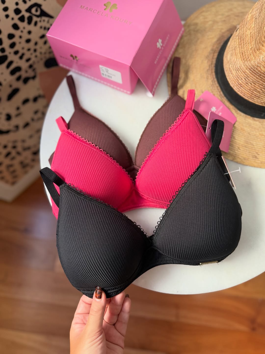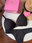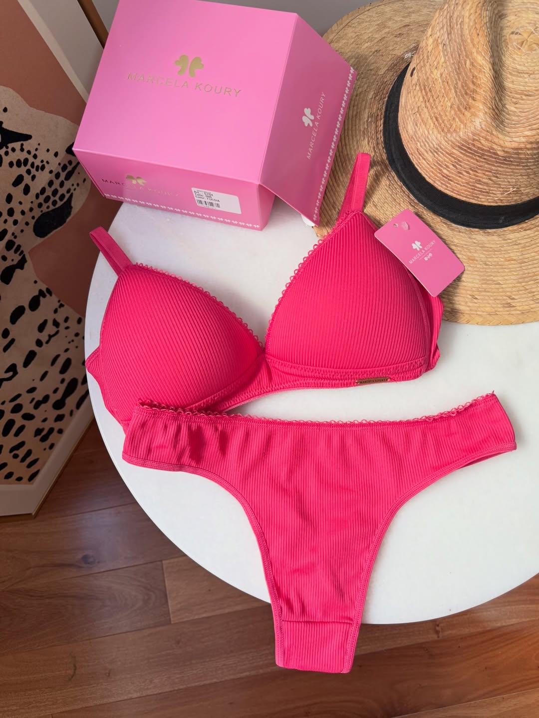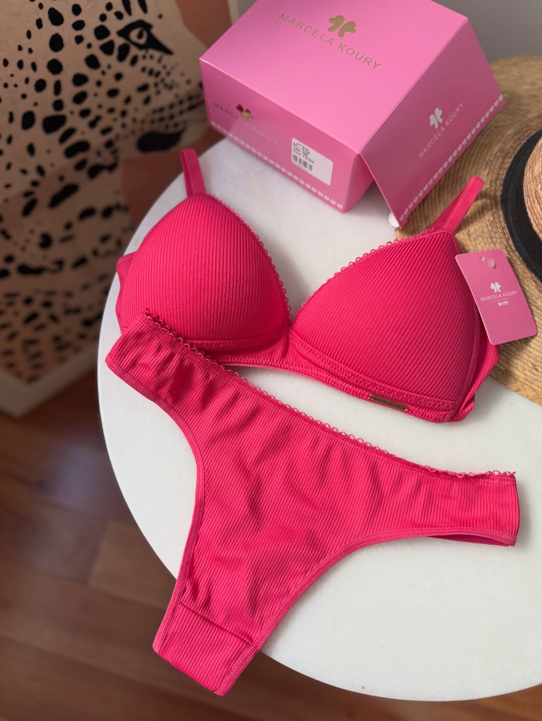 Corpiño triangulito taza soft, sin aros, con base. Breteles regulables y broche en espalda. La bombacha es colaless