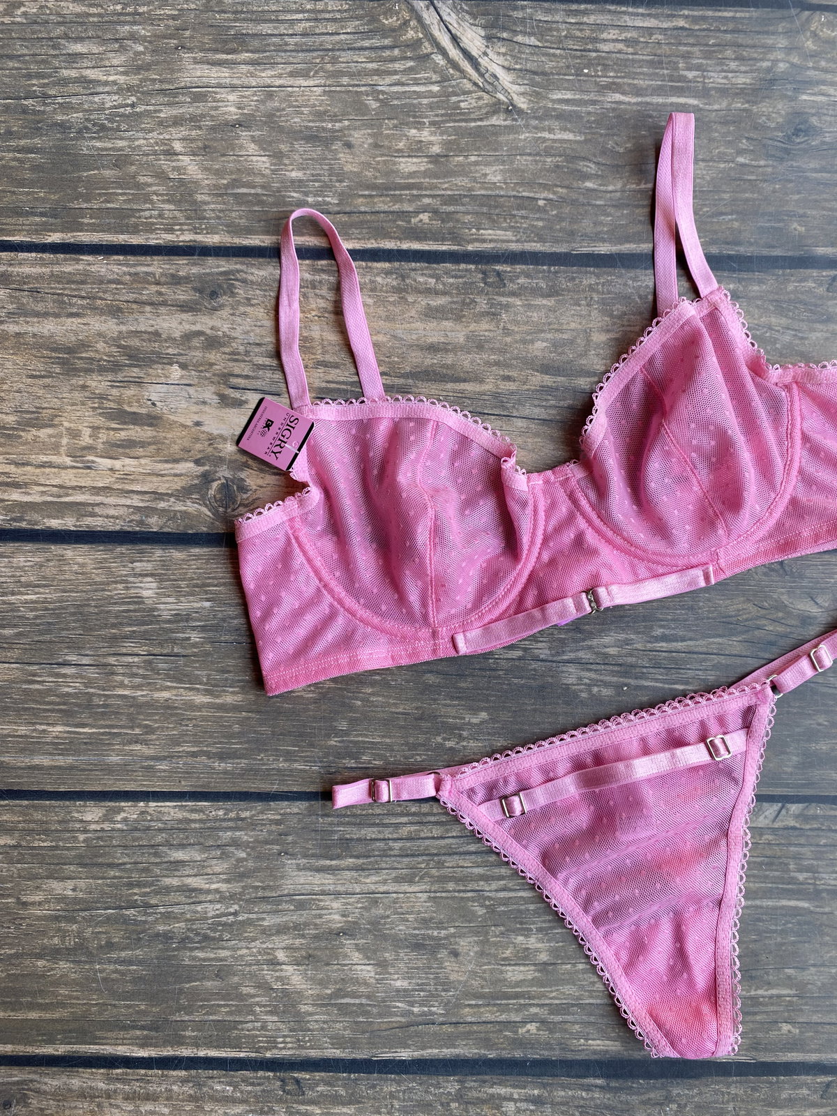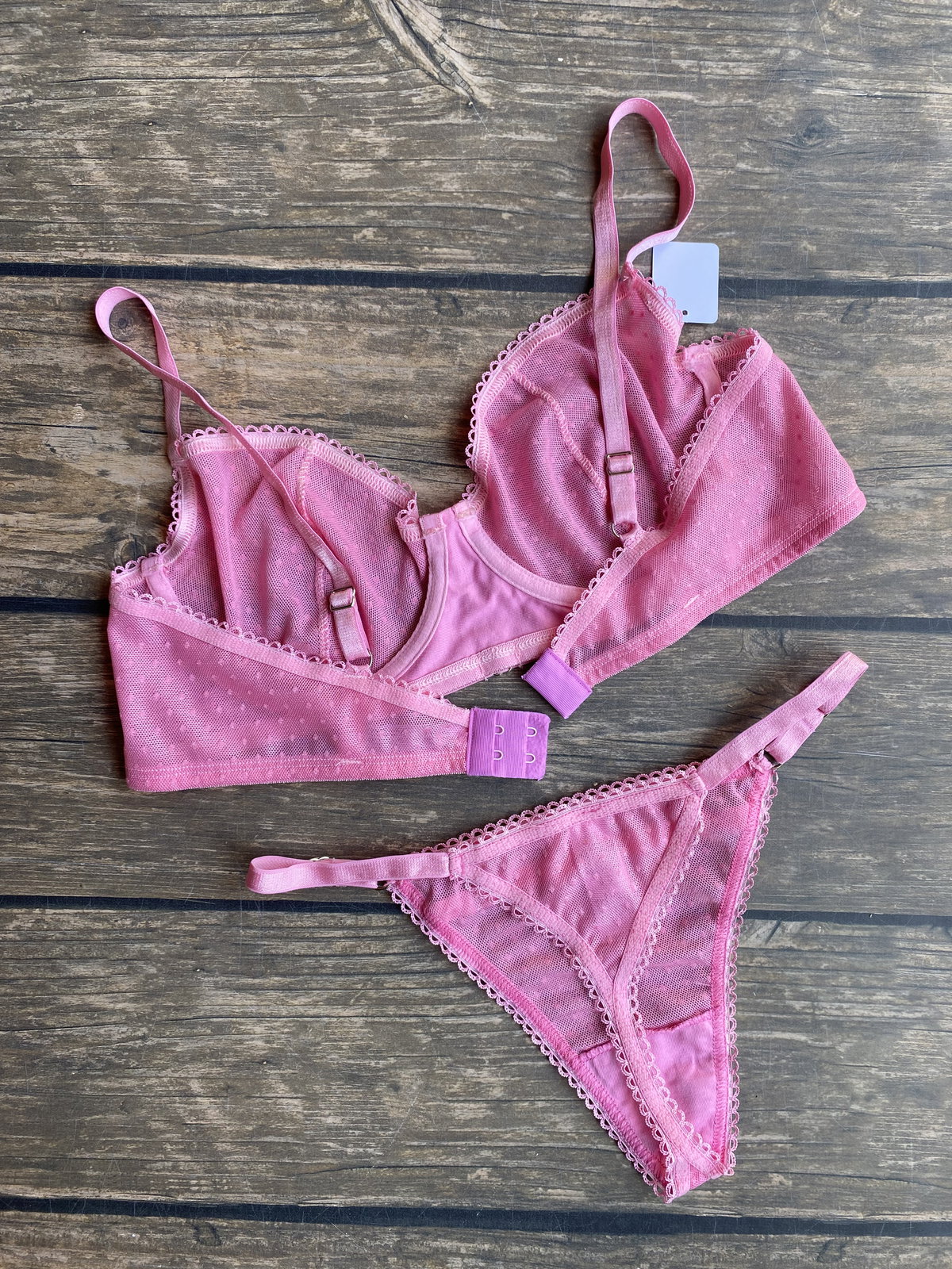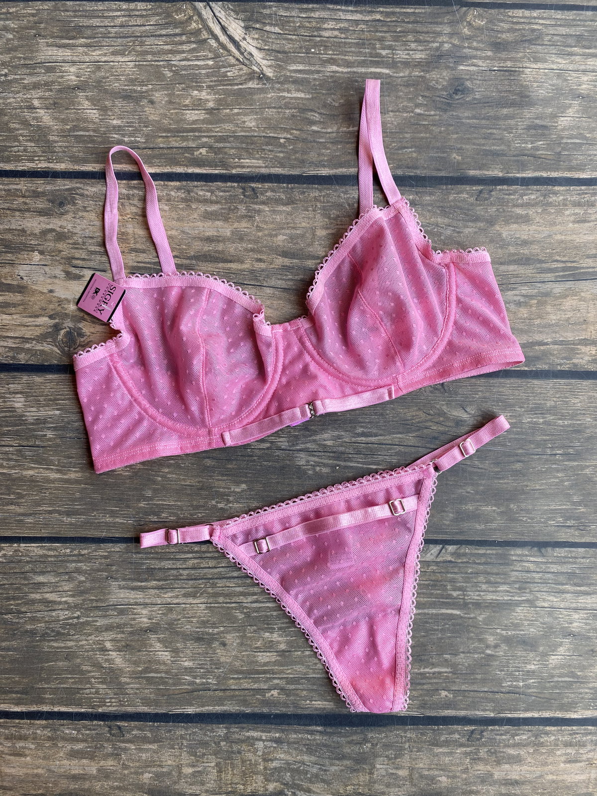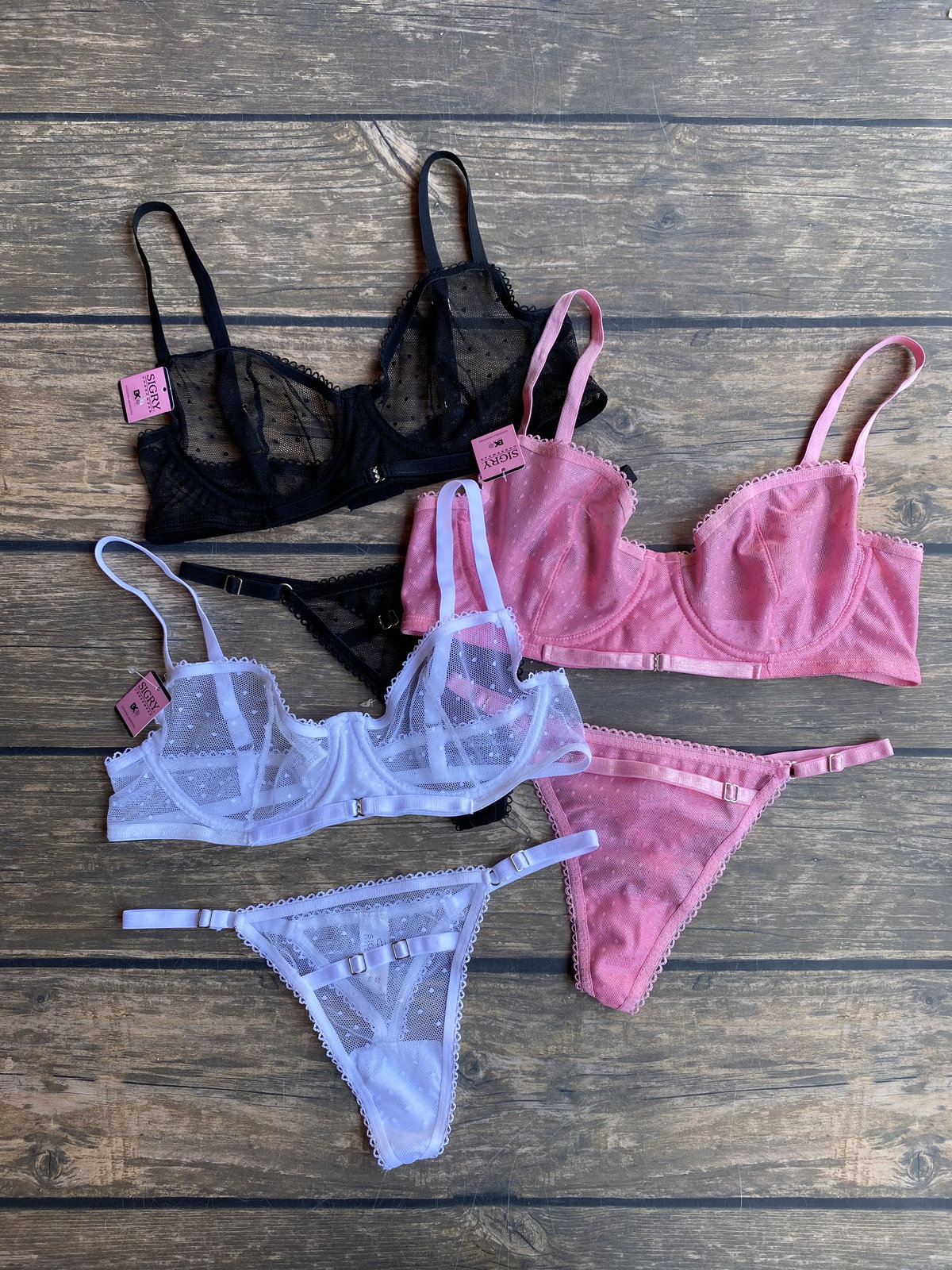 El corpiño con aro realza naturalmente y está confeccionado en microtul suave con textura de lunares, mientras que la bombacha colaless cuenta con tiras regulables que se adaptan a tu cuerpo. Los moñitos y terminaciones en puntilla le suman un toque romántico sin perder lo sexy.