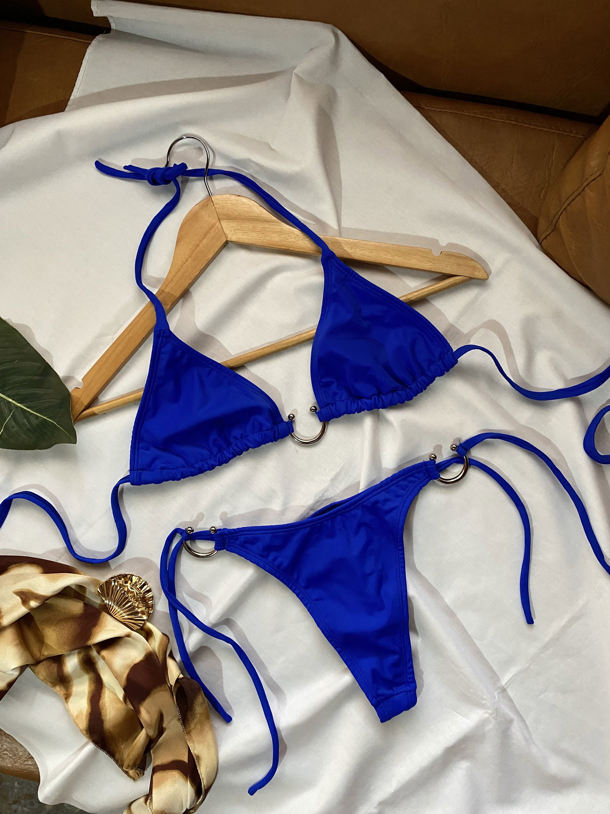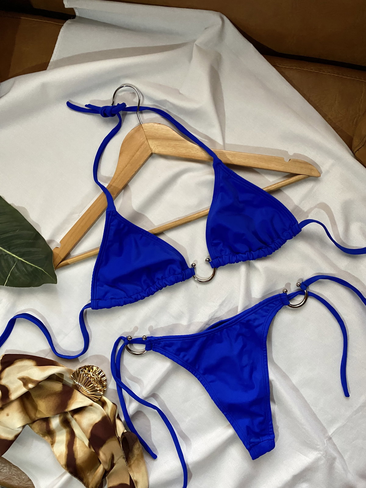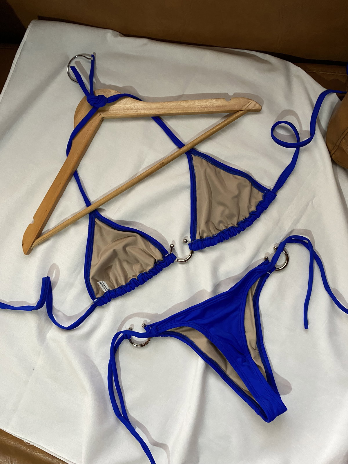La bombacha es colaless alta con tiras para atar y avíos herradura.