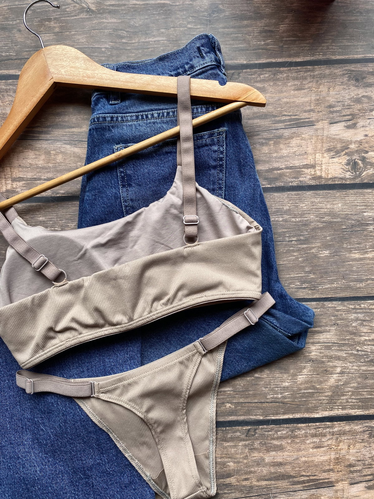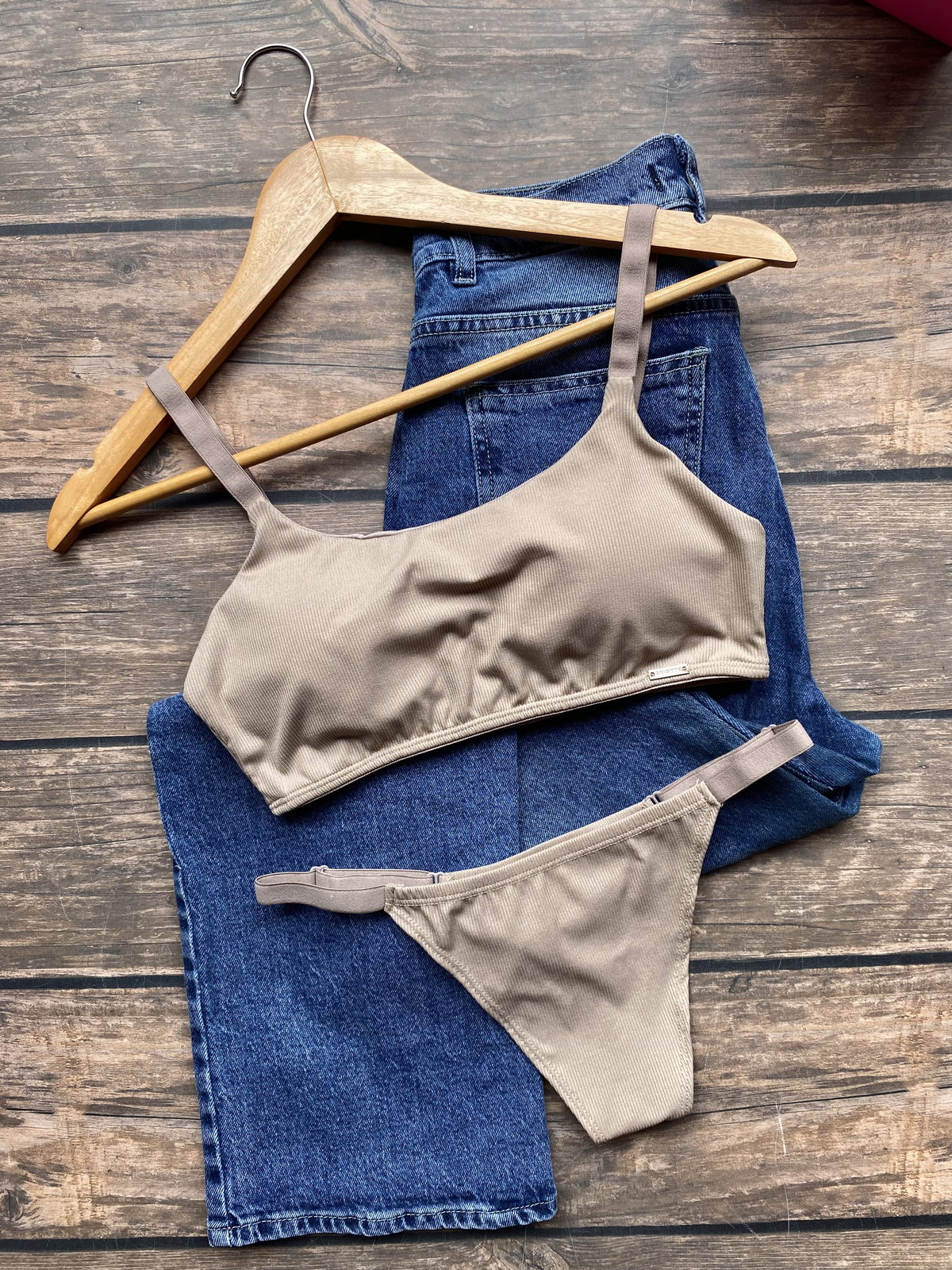 Corpiño top con tazas desmontables y breteles regulables, con buen agarre y contención. Bombacha colaless regulable con breteles anchos.